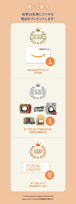 ・当社は利用者からの承諾を個別にいただくことなく、応募内容を無償にて、複製、加工、編集、頒布、二次的著作物の作成その他の方法で利用し、または、第三者に利用させることができるものとします。利用者は著作者人格権を行使しないものとします。投稿いただいた内容は、入賞したか否かにかかわらず、当社が運営するウェブサイトやメールマガジン、公式SNSアカウントの投稿データ、当社が出稿する媒体・広告など(新聞・雑誌・WEB広告など)に使用させていただく場合があります。